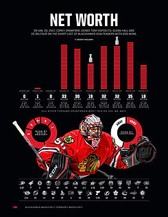 I brainstormed, researched and designed various infographics for Blackhawks Magazine, a monthly publication sold and distributed at home games. Graphics were typically dependent on recent or upcoming player milestones and accomplishments and were sometimes modified for web, as well.